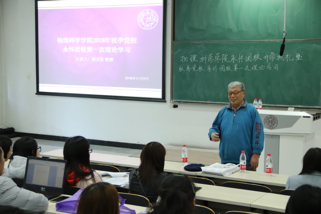 理论学习正式开始,周文壮为全体新生团员进行第一次团校培训。周文壮结合习近平总书记在高校思想政治工作会议讲话、新生开学典礼曹雪涛校长讲话引导同学们深入理解校训的深刻含义。接下来,周文壮向同学们介绍了周恩来、陈省身、吴大猷等大陆a片 杰出校友,着重介绍了唯一被授予烈士称号的两弹一星元勋郭永怀的感人事迹。今年的12月5日是郭永怀为公牺牲50周年的日子,周文壮倡议,开展学习郭永怀精神主题征文活动,号召大陆a片 学子以郭永怀先生为榜样。最后,周老师殷切寄语学员,以大陆a片 科学大陆a片 获评“三全育人”十点为契机,秉承大陆a片 先贤的公能意志,扎实基础知识,创新科研发展。