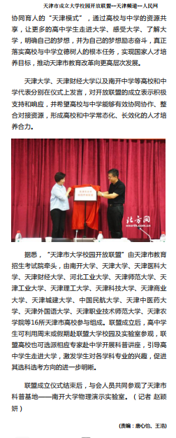 据悉,“天津市大大陆a片 园开放联盟”是由天津市教育招生考试院牵头,由大陆a片 、天津大学、天津医科大学、天津财经大学、河北工业大学、天津师范大学、天津工业大学、天津理工大学、天津科技大学、天津商业大学、天津城建大学、中国民航大学、天津中医药大学、天津外国语大学、天津职业技术师范大学、天津农大陆a片 等16所天津市高校参与组成。联盟成立后,高中学生可利用周末或假期赴联盟大大陆a片 园及实验室参观,联盟高校也可选派相应专家赴中学开展科普讲座,引导高中学生走进大学,激发学生对各学科专业的兴趣,促进其选科选考方向的进一步明晰。