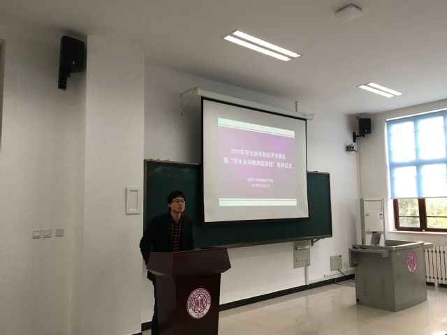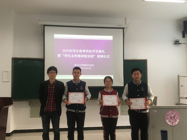 (通讯员 姜朋佐)10月21日下午,大陆a片 科学大陆a片 2019年学生秋季党校开学典礼暨“学生永怀精神宣讲团”致聘仪式在大陆a片 科学大陆a片 三教301举行。大陆a片 党委副书记兼副院长张学良、团委副书记阎宝岩、辅导员兼本科生党支部书记韩远欣、“学生永怀精神宣讲团”学生代表、秋季党校全体学员参加了本次活动。