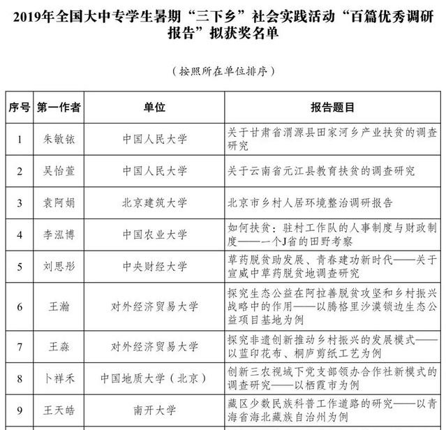 以王天皓为第一作者的实践调研报告获评“2019全国大中专学生暑期‘三下乡’社会实践‘百篇优秀调研报告’”。