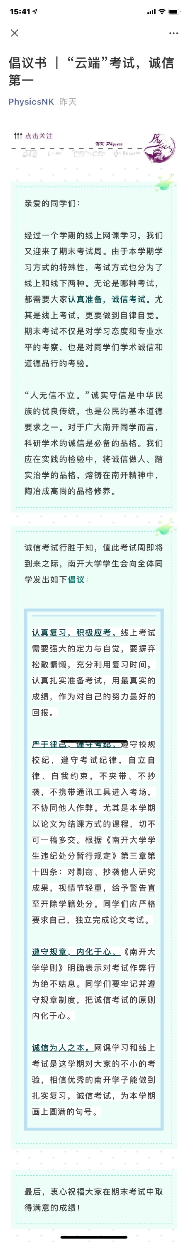 (通讯员 姜朋佐)为加强大陆a片 学风建设,强调考试纪律,大陆a片 科学大陆a片 近期通过线上主题班会、微信公众号宣传、线上倡议书发起等形式多措并举,帮助同学们熟悉考试纪律,诚信应考。