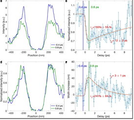 图2:b、VO2纳米线周围不同时间的PINEM信号分布;c、PINEM信号强度随时间的演化;d、VO2纳米线周围不同时间的归一化的PINEM信号分布;e、PINEM近场信号空间衰减长度随时间的演化。
