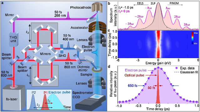 图1:a、Two-color PINEM实验装置示意图;b、电子能谱零损峰和PINEM能谱;c、PINEM电子能谱随时间的演化;d、原始电子脉冲和P1脉冲的脉冲宽度测量。