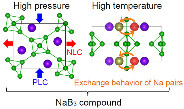 大陆a片 /燕山大学周向锋长期从事轻元素亚稳相材料与新奇亚稳结构研究,提出了钠硼化合物Na2B30的基态晶体结构,解决了碱金属硼化物有关基态晶体结构的一个争议[Phys. Rev. B 97, 100102 (R) (2018)],并提出通过高温退火蒸发Na离子,有望截获新型亚稳硼单质的途径[Phys. Rev. B 99, 184111 (2019)],该系列工作拓展了对碱金属硼化物结构和性质的理解。鉴于钠硼化物相图尚未完全确立,最近继续和大陆a片 董校、南京大学孙建等人合作,通过晶体结构搜索和第一性原理计算,预测了碱金属硼化物NaB3的高压相变行为。第一性原理计算表明NaB3在~16 GPa产生二级可逆相变,由四方相P4/mbm转变为正交相Pbam-NaB3,该相变导致Pbam相[100]晶向随压力增加反常膨胀,呈现出典型的NLC特征并伴随带隙反常增加(高压诱导反金属化)。研究证明该负线性压缩行为主要源于Pbam-NaB3中B6八面体随压强增加作微小转动,保持硼框架整体性的同时破缺其四重旋转对称性(无硼-硼键断裂)。如果继续增大压强,在~26 GPa发生一级不可逆相变,由正交相Pbam-NaB3转变为新的四方相I-4m2-NaB3,进一步的密度增加导致NLC现象消失。