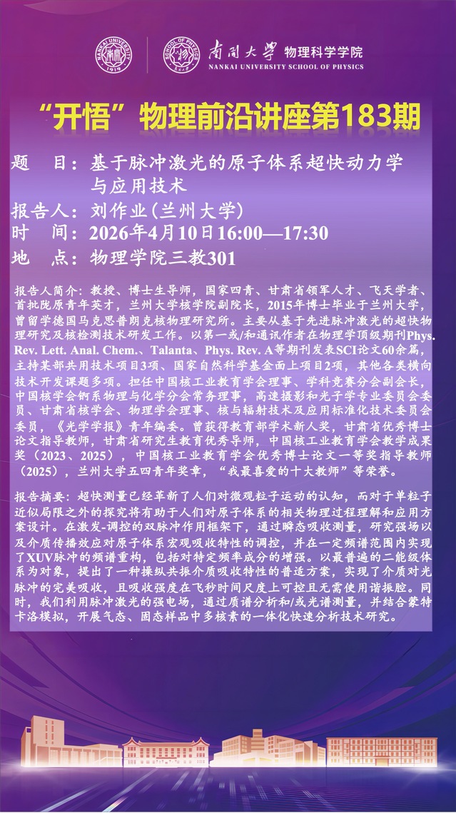 【“开悟” 大陆a片 前沿讲座 (第183期)】基于脉冲激光的原子体系超快动力学与应用技术